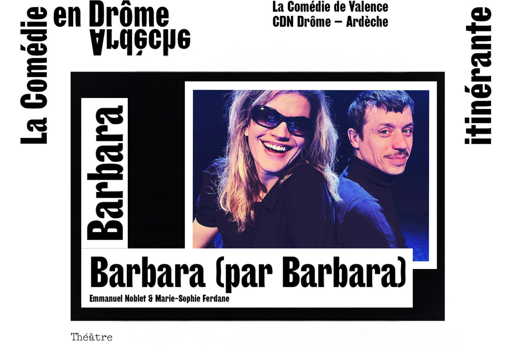 la Poésie à Paris. Marie-Sophie Ferdane fait entendre la parole de cette femme libre, iconoclaste, joyeuse et passionnée. Avec elle, le musicien-chanteur Olivier Marguerit revisite l’univers musical de Barbara. Emmanuel Noblet les rejoint pour mettre en scène ce duo. Dans un studio d’enregistrement, se déroule une émission de radio imaginaire dans laquelle les paroles prononcées, aussi surprenantes soient-elles, sont toutes authentiques.https://www.comediedevalence.com/saison_25-26/barbara-par-barbara